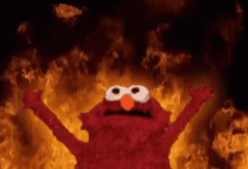 Elmo from Sesame Street stands with arms raised, engulfed by intense flames.