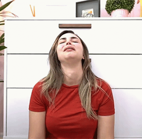Jana Taffarel crying in a red t-shirt, looking very sad and emotional.