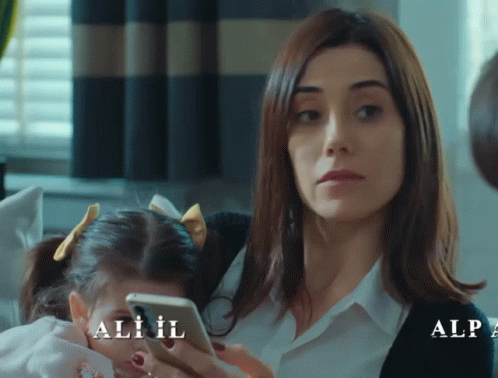 Cansu Dere as Asya with Ali Il, a young girl, looking at a phone in a scene from the Turkish drama Sadakatsiz.