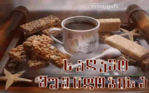 A warm good evening greeting with a cup of coffee and delicious nut and seed bars on a tray.