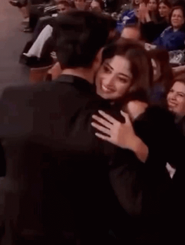 Sajal Aly and Ahad Raza Mir share a warm hug, smiling brightly at an event.