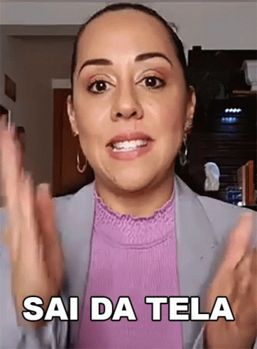 Evelyn Castro emphatically tells viewers to 'Sai Da Tela Agora!' (Get Off The Screen Now!), wearing a purple sweater and blue jacket.