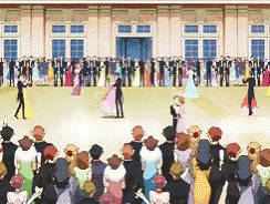 Usagi and Mamoru dance at a grand ball in this iconic Sailor Moon anime scene, surrounded by other characters.