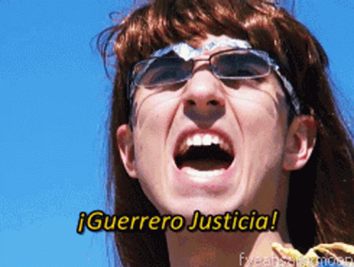 A person in a Sailor Moon costume shouts '¡Guerrero Justicia!' (Warrior Justice!) while striking a pose.