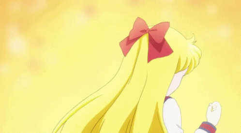 Sailor Venus from Sailor Moon, with long blonde hair and a red bow, smiles sweetly.