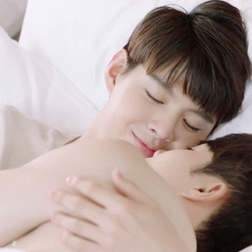 Saintsup Suppapong Udomkaewkanjana and Zee Pruk Panich share a sweet kiss while cuddling in bed.