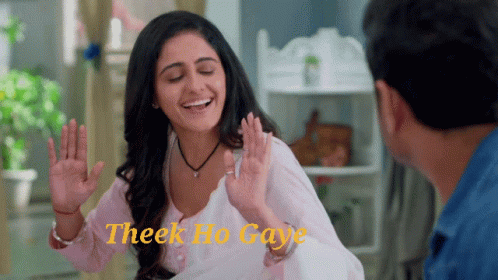 Sai Joshi from Sairat laughs joyfully, with the caption 'Theek Ho Gaye' (You are fine now) displayed on screen.