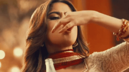 Sajalaly Sahad covering her nose while holding a bottle in a warm, festive setting.