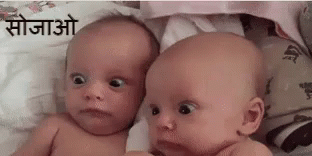 Two adorable babies with wide, surprised eyes, ready for bed. A cute 'Sojao, Sleep Now' moment.