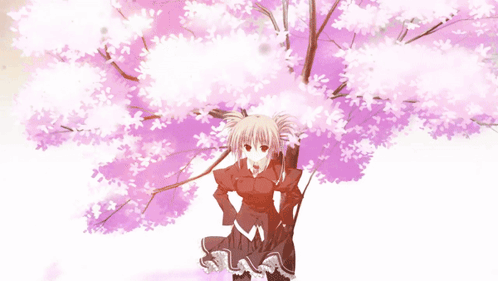 a girl stands under a tree with pink flowers