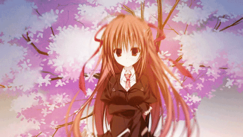 a girl with long red hair stands in front of a tree with pink flowers
