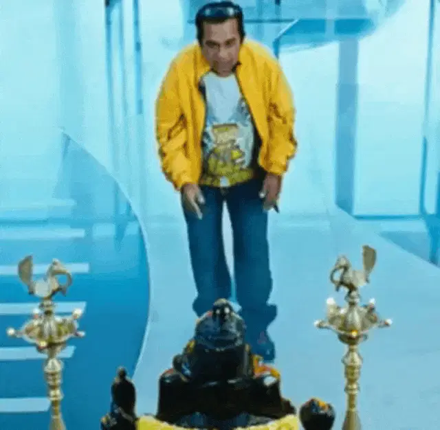 Florin Salam performs live, singing manele music into a microphone and pointing to the crowd.