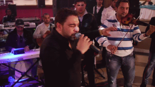 Florin Salam performs live, singing into a microphone while another musician plays the violin.