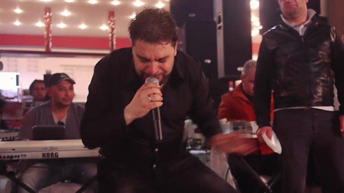 Florin Salam performs a passionate manele song live, singing into a microphone with a Korg keyboard nearby.