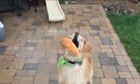 A golden retriever dog skillfully catches a hot dog bun, then proudly holds a hot dog in its mouth on a patio.