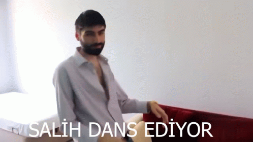 Salih dances and grooves while sitting on a red couch in a room, with Turkish text visible on screen.