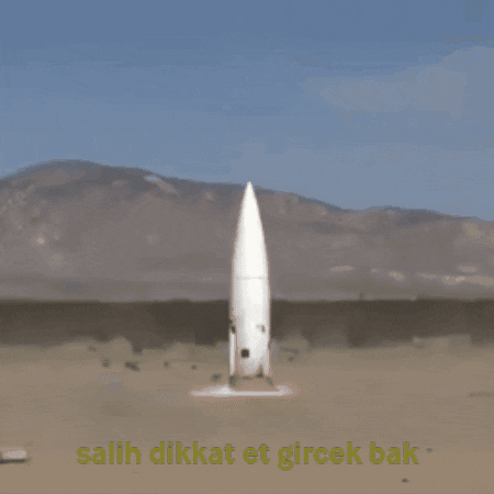 A white rocket launches vertically from a desert landscape, accompanied by a Turkish warning caption.