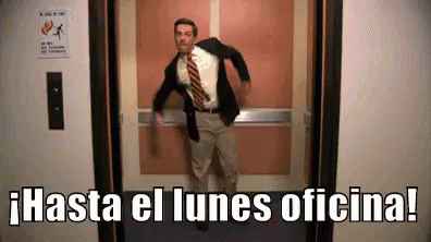 Man in suit dances out of an elevator, celebrating the end of the work week with 'Hasta el lunes oficina!'