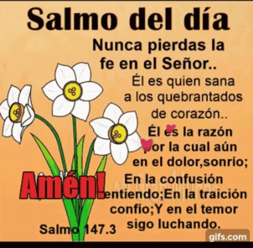 Inspirational message from 'Salmo del día' with white flowers, encouraging faith and resilience.