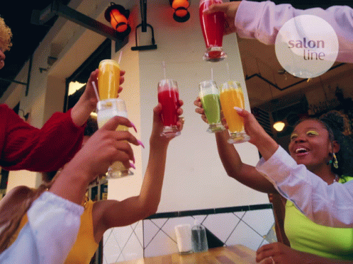 Friends toast with colorful drinks in a vibrant setting, celebrating with Salon Line products.
