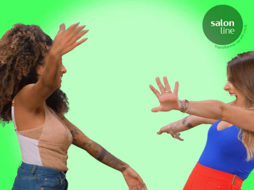 Gabi Moretti and Yuli Balzak share a joyful hug, celebrating their hair with Salon Line products.