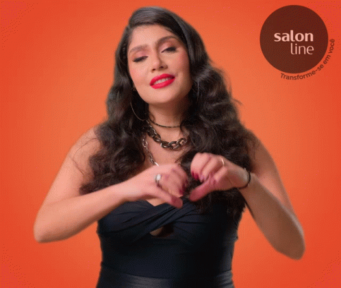 Mari Bannwart poses for Salon Line, making a heart gesture with her hands against an orange background.