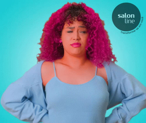 Woman with vibrant pink curly hair, hands on hips, looking sassy for Salon Line Camartins.