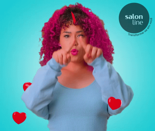 Woman with pink curly hair points to animated hearts, promoting Salon Line Camartins.