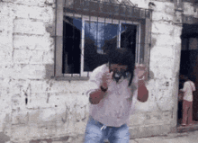 A man energetically dances the Salteño Pasito in front of a brick building, showcasing his unique moves.