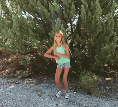 Silvia Sanchez joyfully jumps and celebrates in front of a lush green tree.