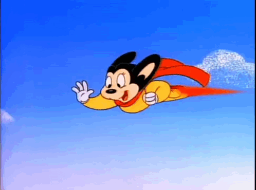 Mighty Mouse, also known as Super Raton, flies through a bright blue sky with a cheerful expression.
