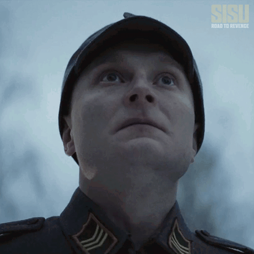 A soldier in a helmet looks up to the sky and gives a solemn salute in a scene from Sisu: Road to Revenge.