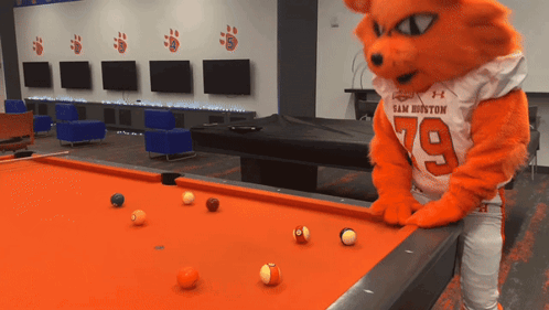 a mascot wearing a jersey that says sam houston is playing pool