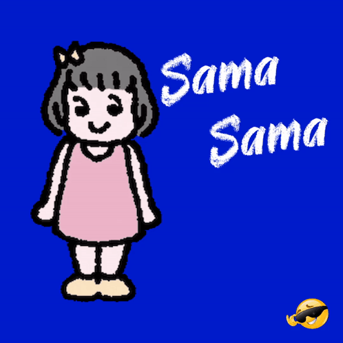 An animated drawing of a girl bowing and standing, accompanied by the text 'Sama Sama' on a blue background.