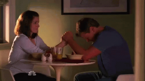 Liz Lemon and Jack Donaghy from 30 Rock share an awkward, funny moment over cereal, holding hands at the table.