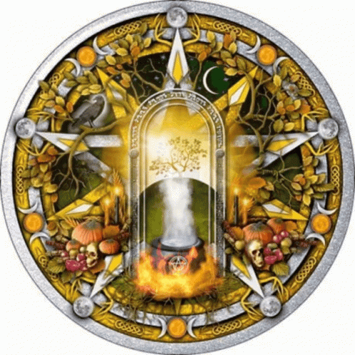 An intricate circular artwork depicting a Samhain festival pentacle with a cauldron, autumn leaves, and mystical elements.