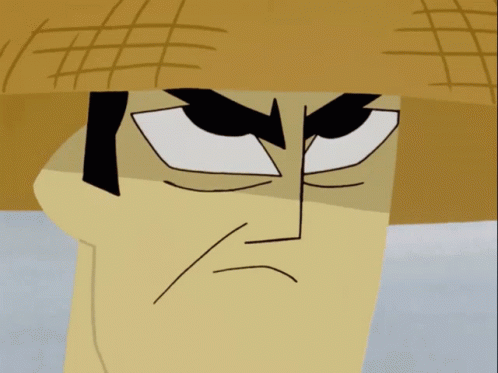 Samurai Jack looks distressed, covering his ears, then appears sad and disappointed.
