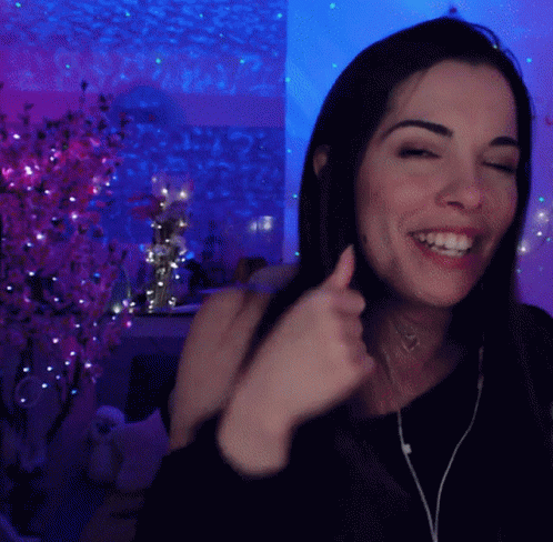 A woman with long dark hair gives a double thumbs-up gesture in a vibrant, neon-lit room.