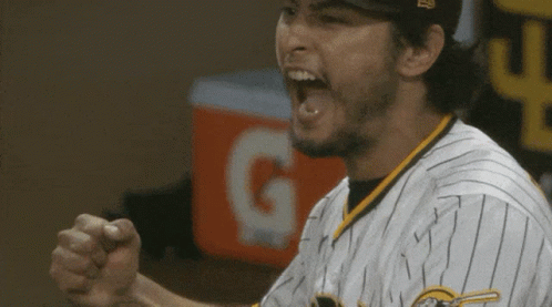 San Diego Padres pitcher Yu Darvish yells and pumps his fist in excitement during a baseball game.