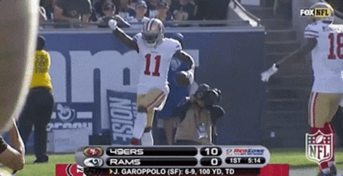 Marquise Goodwin of the San Francisco 49ers celebrates a touchdown with a dance during a game.
