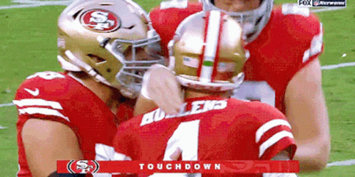 San Francisco 49ers quarterback Nick Mullens celebrates a touchdown with a teammate on the field.