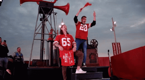 Two enthusiastic fans in red 49ers jerseys, one with number 65, are cheering loudly and waving a red flag.