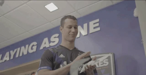 San Jose Earthquakes player Luis Felipe makes it rain with dollar bills in front of a 'PLAYING AS ONE' wall.