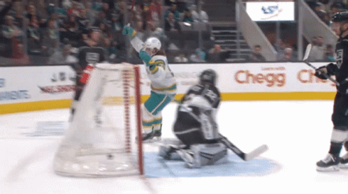 Alexander Barabanov of the San Jose Sharks celebrates scoring a goal during an NHL hockey game, raising his stick and pumping his fist.