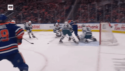 James Reimer makes a crucial save for the San Jose Sharks during an intense hockey game.
