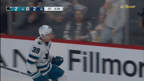 San Jose Sharks player Logan Couture celebrates an overtime goal with his teammates on the ice.