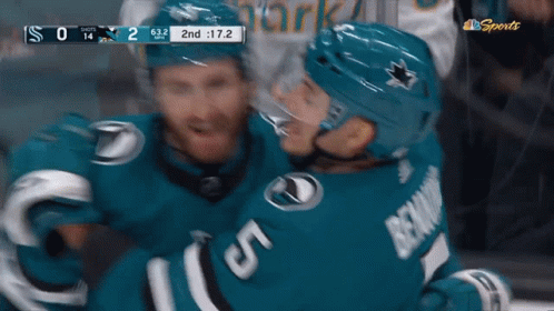 Noah Gregor of the San Jose Sharks celebrates a goal with teammates during an NHL hockey game.