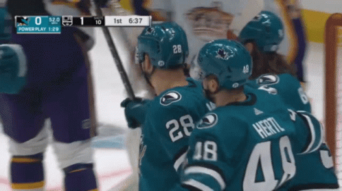 Timo Meier (28) and the San Jose Sharks on the ice during an NHL game against the LA Kings, with Hertl (48) also visible.