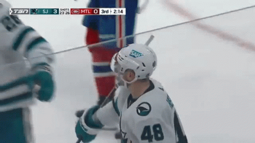 Tomas Hertl celebrates after scoring a goal for the San Jose Sharks, putting them ahead 4-3.