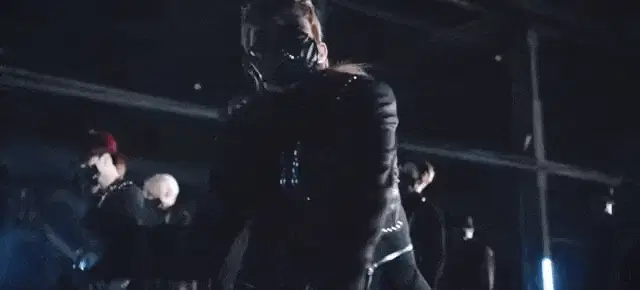 ATEEZ member San with purple hair, wearing a microphone, then playfully looking over another member's shoulder.